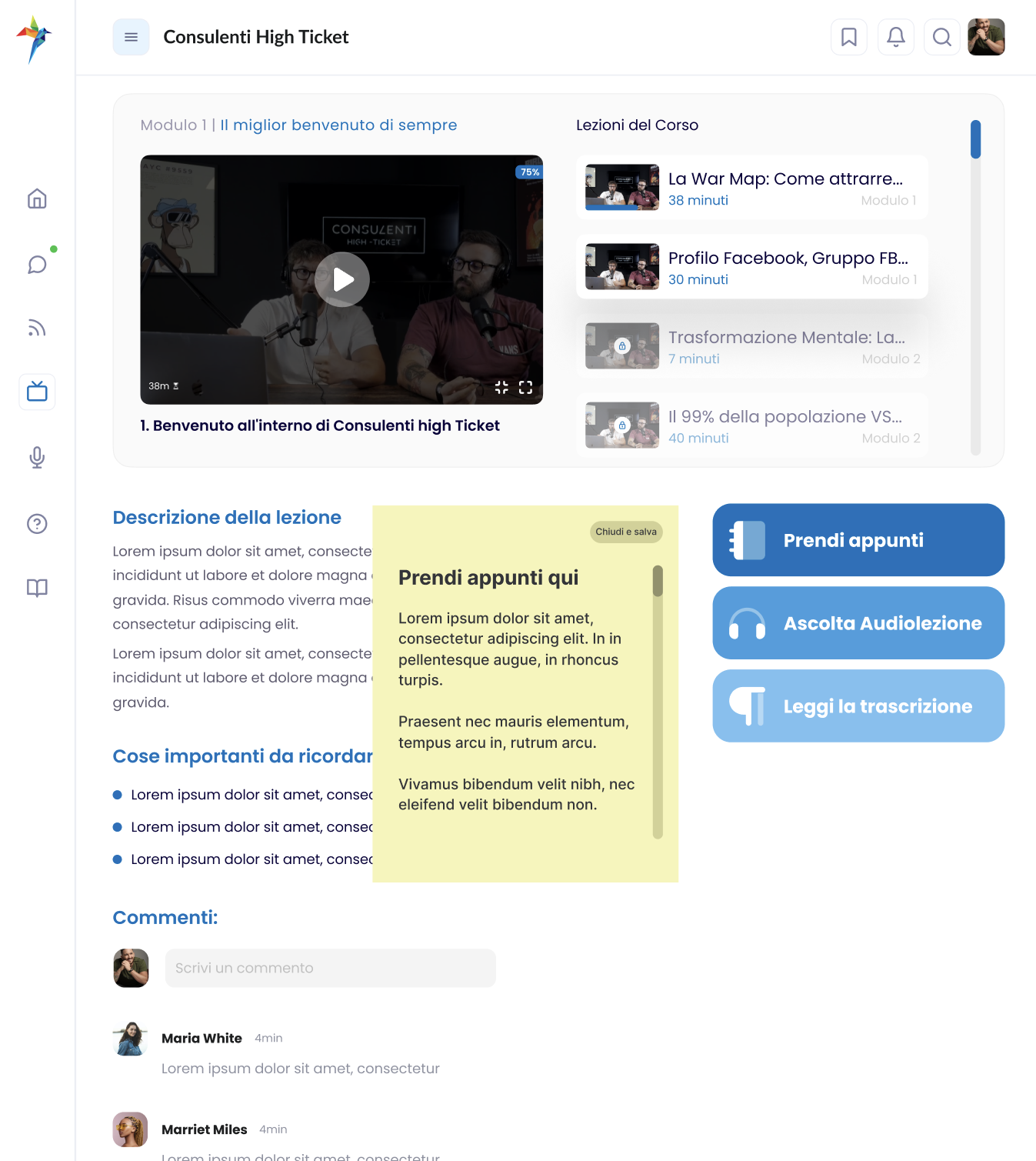 Crea i tuoi video corsi e classi interattive con quiz e sfide per aumentare l’attenzione. Dai vita a community protette e gamificate per poter aumentare il senso di appartenenza. Supporta i tuoi clienti con classi live, video coaching e chat private e trascrizioni automatiche dei tuoi video.